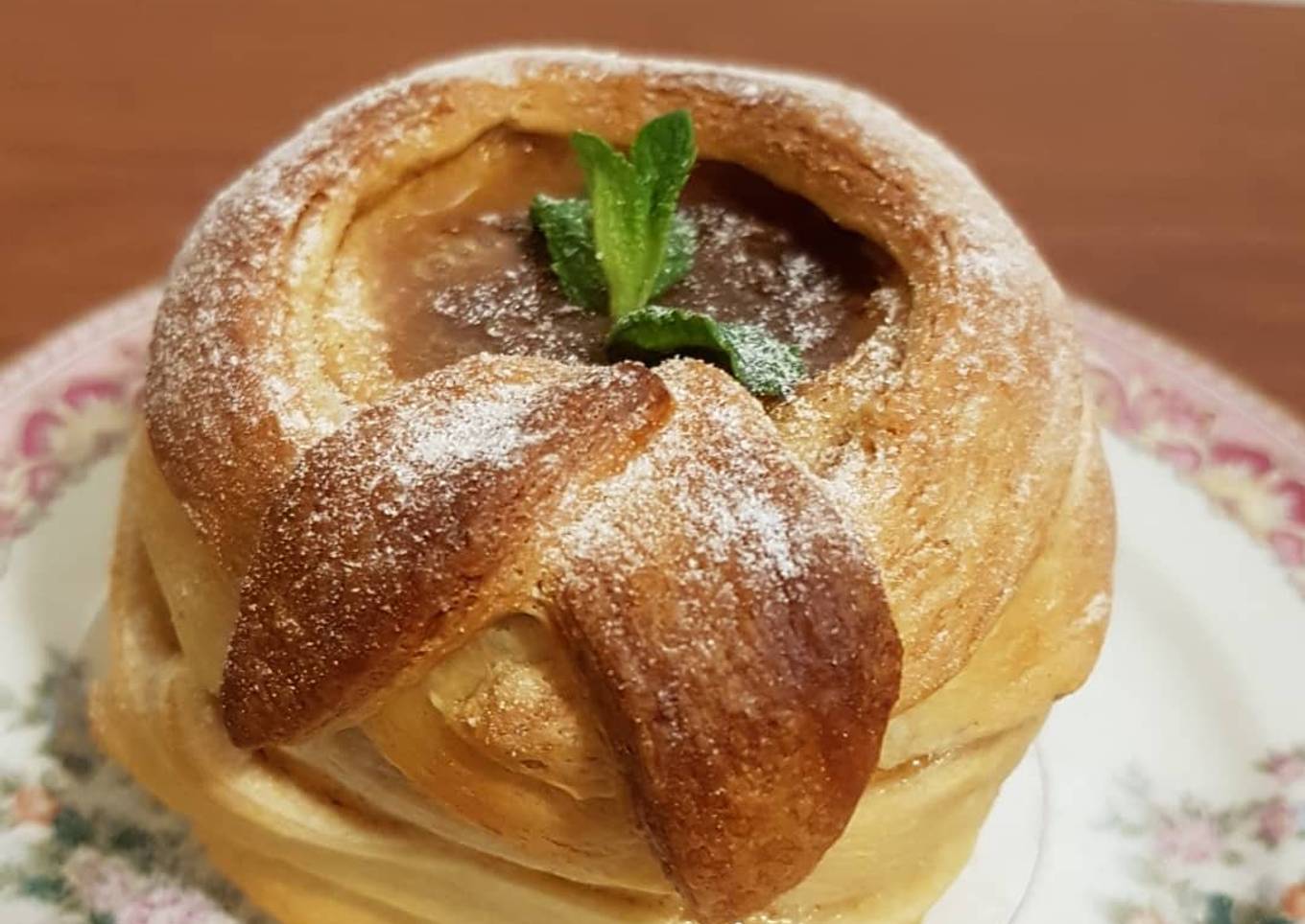 - Trempent les pommes dans le sucre à la cannelle. Coupez la pâte en lamelles.envelopper les pommes de la pâte. Mettez le caramel à l'intérieur de chaque pomme 1c.a.soupe environ.