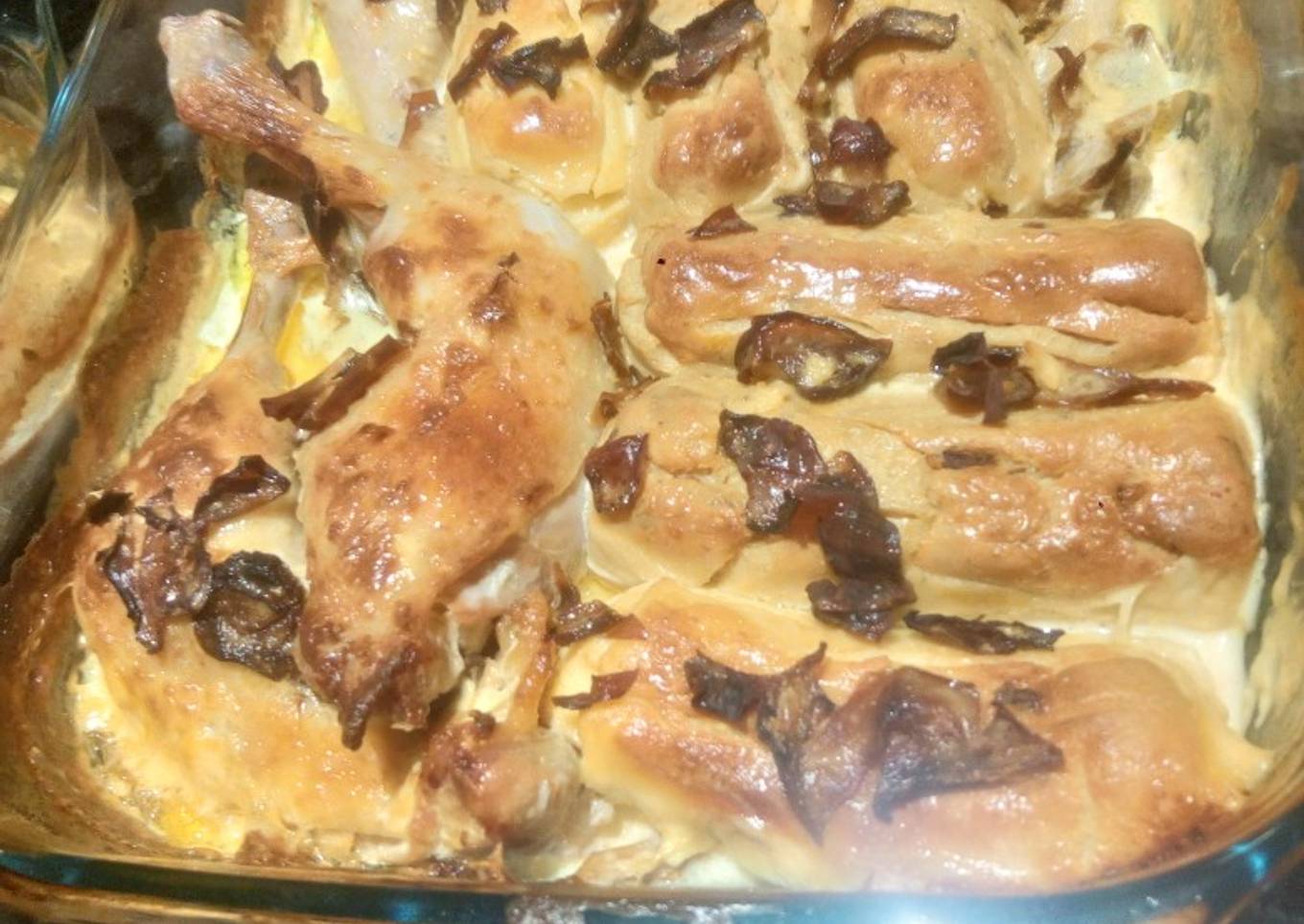 - Mettre dans un plat les quenelles, les cuisses de poulet et les champignons
