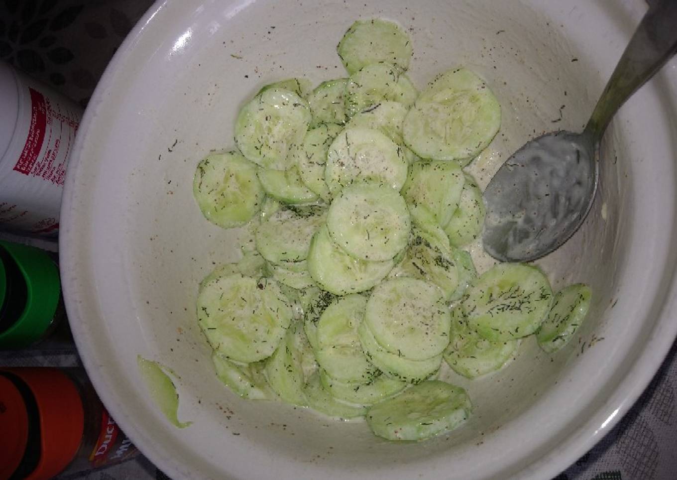 - Éplucher les concombres, les couper en rondelles. Mettre dans un saladier. Saupoudrer du sel et de poivre. Mettre de la muscade. Ajouter la crème fraîche. Bien mélanger. Saupoudrer d'aneth. C'est prêt !