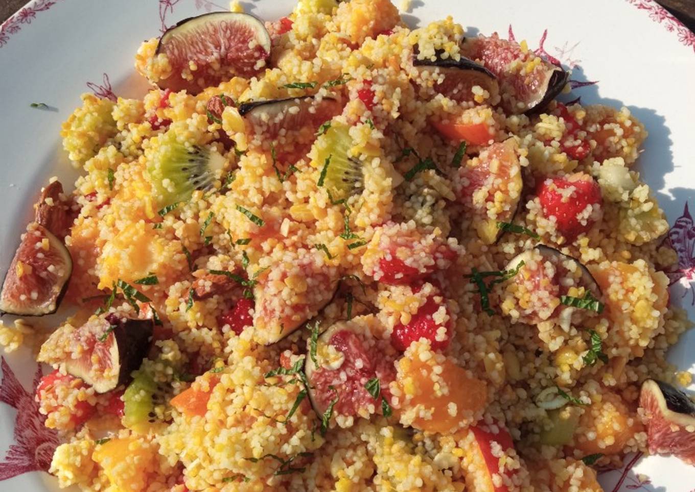 - Couper tout les fruits et les ajouter à la semoule. Ajouter le miel, la fleur d'oranger, le sucre vanillé et les amandes. Mélanger. Ajouter la menthe ciselée. Couvrir et mettre au frais 2 h. A manger en dessert ou pour le goûter