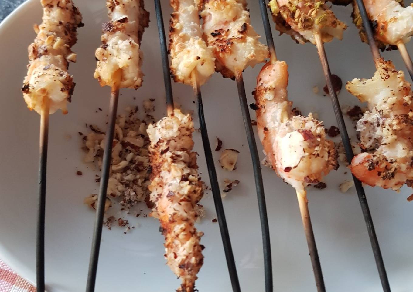 - Piquer vos gambas sur des bâtonnets de bois. Passez les dans le blanc d'oeuf puis quelques-unes dans la chapelure de pistaches, d'autres dans la chapelure d'amandes, et le reste dans la chapelure de noisettes. Salez et faites les cuire quelques minutes sur le grille.