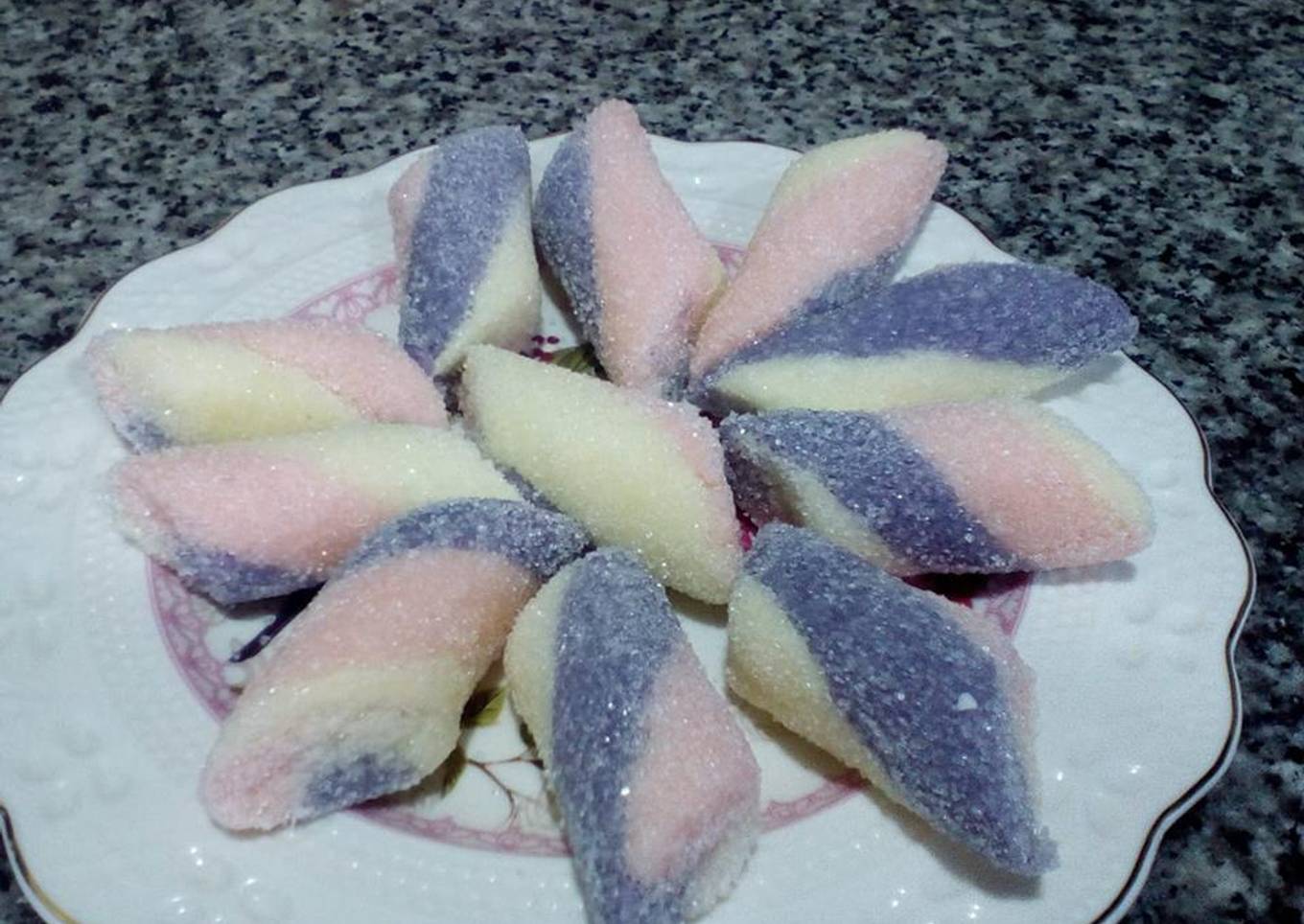 - Diviser la pâte en trois parts égales et colorier deux en rose et mauve laisser la troisième part en blanc