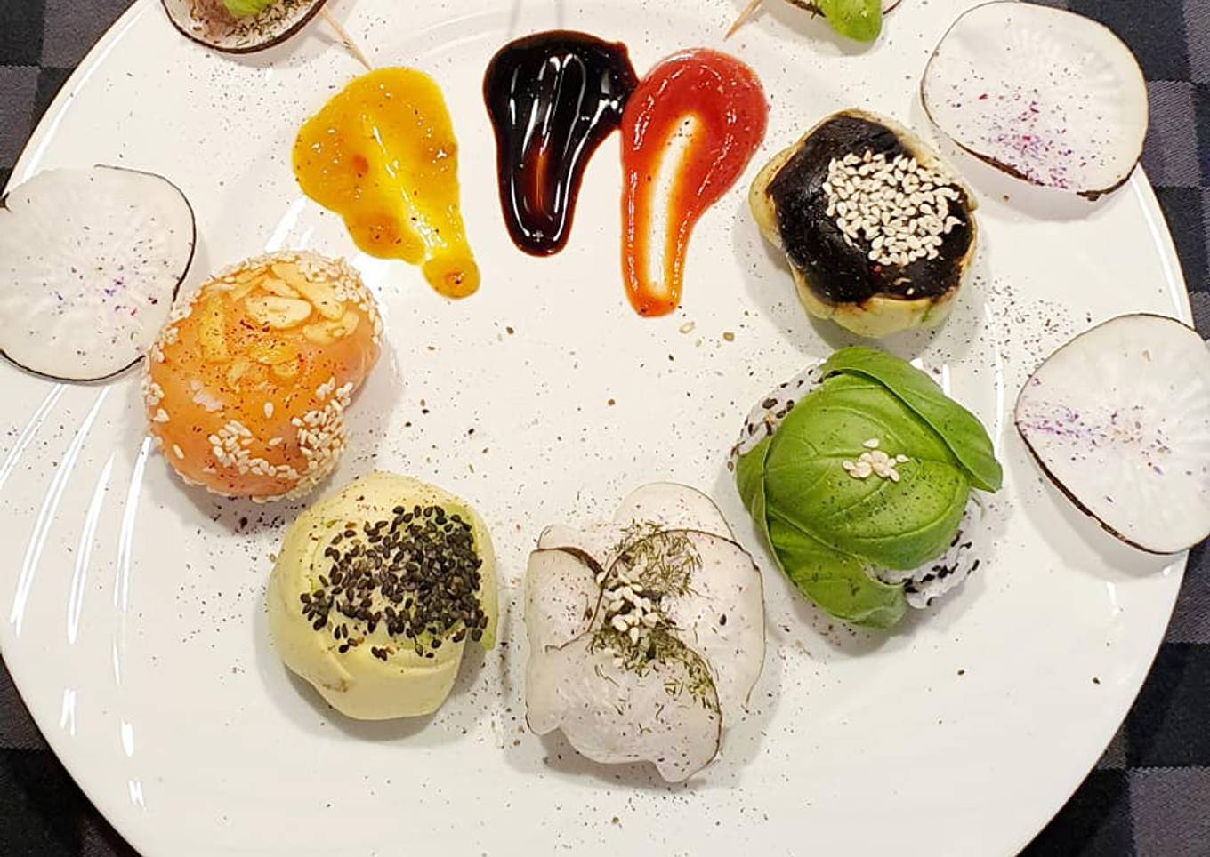 - Faites la même manipulation pour les autres variantes. Pour le radis noir formez une rosace avec 4 rondelles, déposez la boulette de riz, pour l’ail noir idem et ainsi de suite. Réservez au frigo jusqu’au moment du dressage.