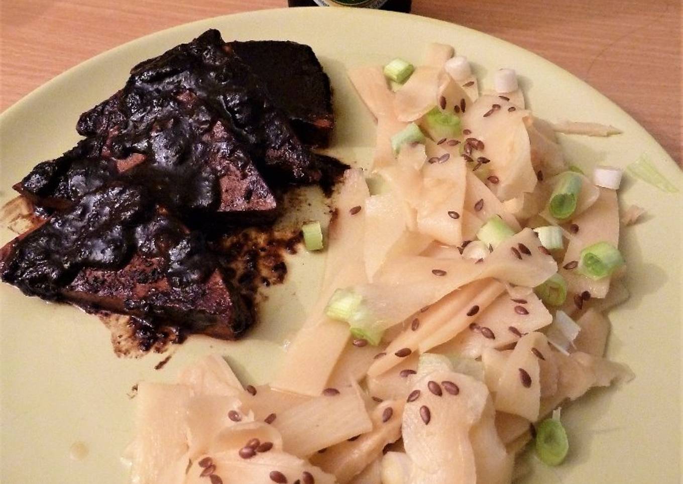 - Pendant ce temps préparer l'accompagnement. là j'ai mis des pousses de bambou avec des pickles de gingembre (j'adooooore ça) de la cébette. et assaisonner avec de l'huile de sésame et du mirin et parsemer de graines de lin.