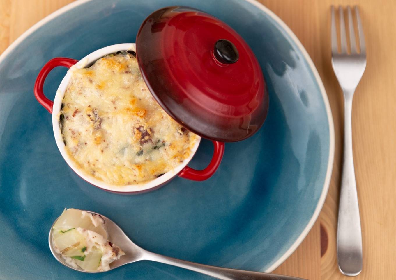 - Dans un plat à gratin (ou cocottes individuelles), étalez les côtes de blettes, puis une couche de béchamel, les champignons, encore une couches de béchamel, les feuilles et pour finir une autre couche de béchamel